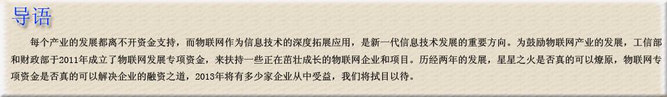 2012年度專項資金與2011年相同,總金額約為5億元。其中,1.5億元被用于支持無錫物聯(lián)網(wǎng)產(chǎn)業(yè)發(fā)展余下的3.5億元的專項資金則由入圍的149家企業(yè)共享,明顯有些僧多粥少的局面。相比2011年5億元資金由不足110家企業(yè)分享,2012年入圍企業(yè)上升到了149家,其中不乏像中國電信這樣的行業(yè)龍頭企業(yè),僧多粥少的局面進一步加劇。而根據(jù)兩部門組織專家對申報的......詳情>> |